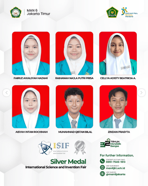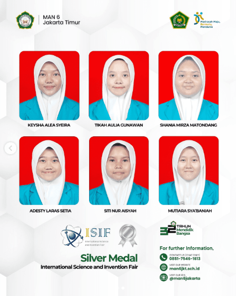 Selamat atas prestasi Peserta Didik yang meraih 12 medali perak (Silver Medal) dalam Kompetisi Internasional ISIF 2025. Selamat untuk Tim Riset MAN 6 Jakarta Timur.