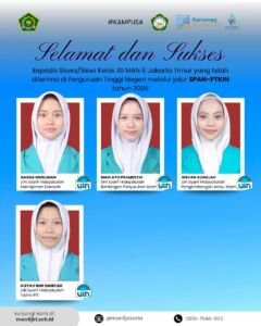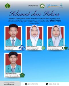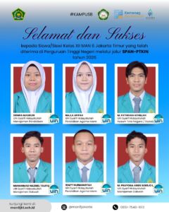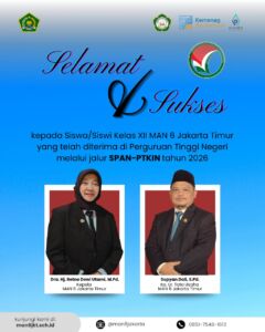 Jakarta (MAN 6 Jakarta Timur) — Kabar membanggakan kembali datang dari peserta didik MAN 6 Jakarta Timur. Sejumlah siswa kelas XII berhasil lulus seleksi masuk perguruan tinggi melalui jalur SPAN-PTKIN Tahun 2026.