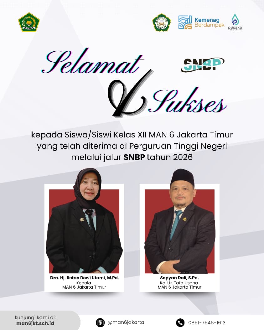 Alhamdulillahi rabbil ‘alamin, kabar membanggakan datang dari keluarga besar MAN 6 Jakarta Timur. Sebanyak 21 siswa kelas XII berhasil dinyatakan lulus Seleksi Nasional Berdasarkan Prestasi (SNBP) Tahun 2026 dan diterima di 13 Perguruan Tinggi Negeri (PTN) di berbagai wilayah Indonesia. Keberhasilan ini merupakan buah dari kerja keras, ketekunan, serta komitmen para siswa dalam menempuh proses pembelajaran selama di madrasah. Selain itu, dukungan dan bimbingan dari para guru serta doa dari orang tua turut menjadi faktor penting dalam mengantarkan para siswa meraih prestasi yang membanggakan tersebut. Seleksi Nasional Berdasarkan Prestasi (SNBP) merupakan salah satu jalur seleksi masuk perguruan tinggi negeri yang menitikberatkan [...]